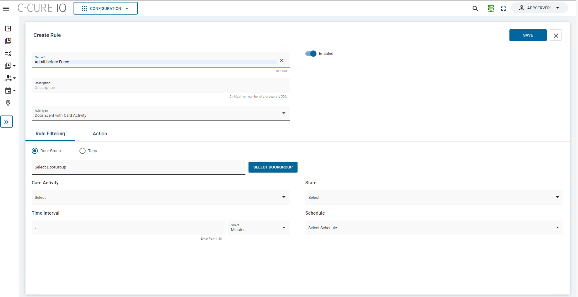 Table 1. Rule Filtering and Action - Fields and Description Fields Description SELECT DOORGROUP Click this button to filter the Door Group by Name or Description. Card Activity Select the following Card Activity from the drop-down. - Admit Before