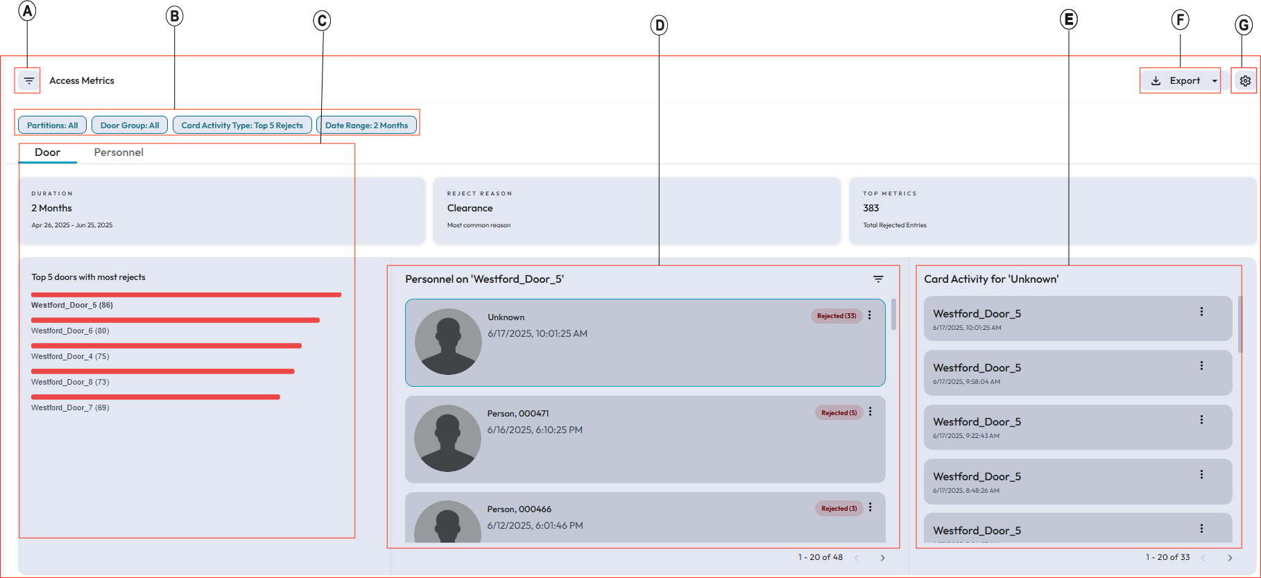 - Identify critical access points with the highest rejection rates, including timestamps and individuals involved. You can analyze access activity either by personnel or by door, which consolidates card activity data and presents the most active doors in a bar graph format.