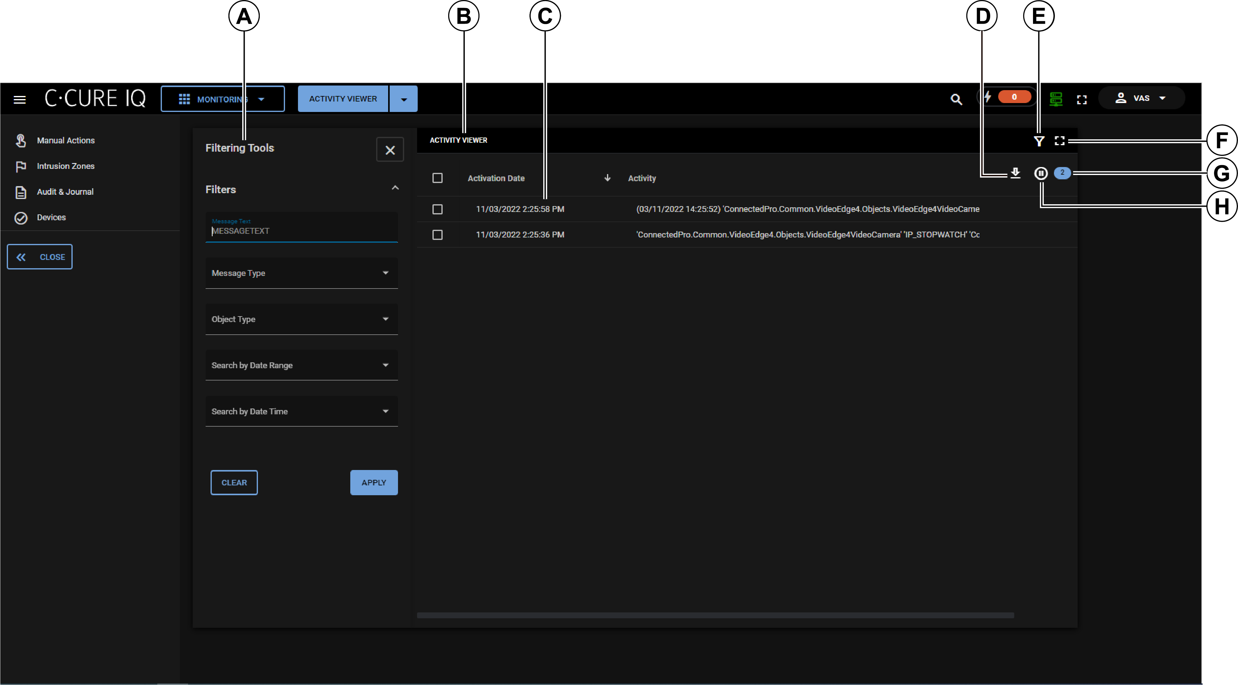 personnel access, device errors, and messages. If the activity viewer is online, it