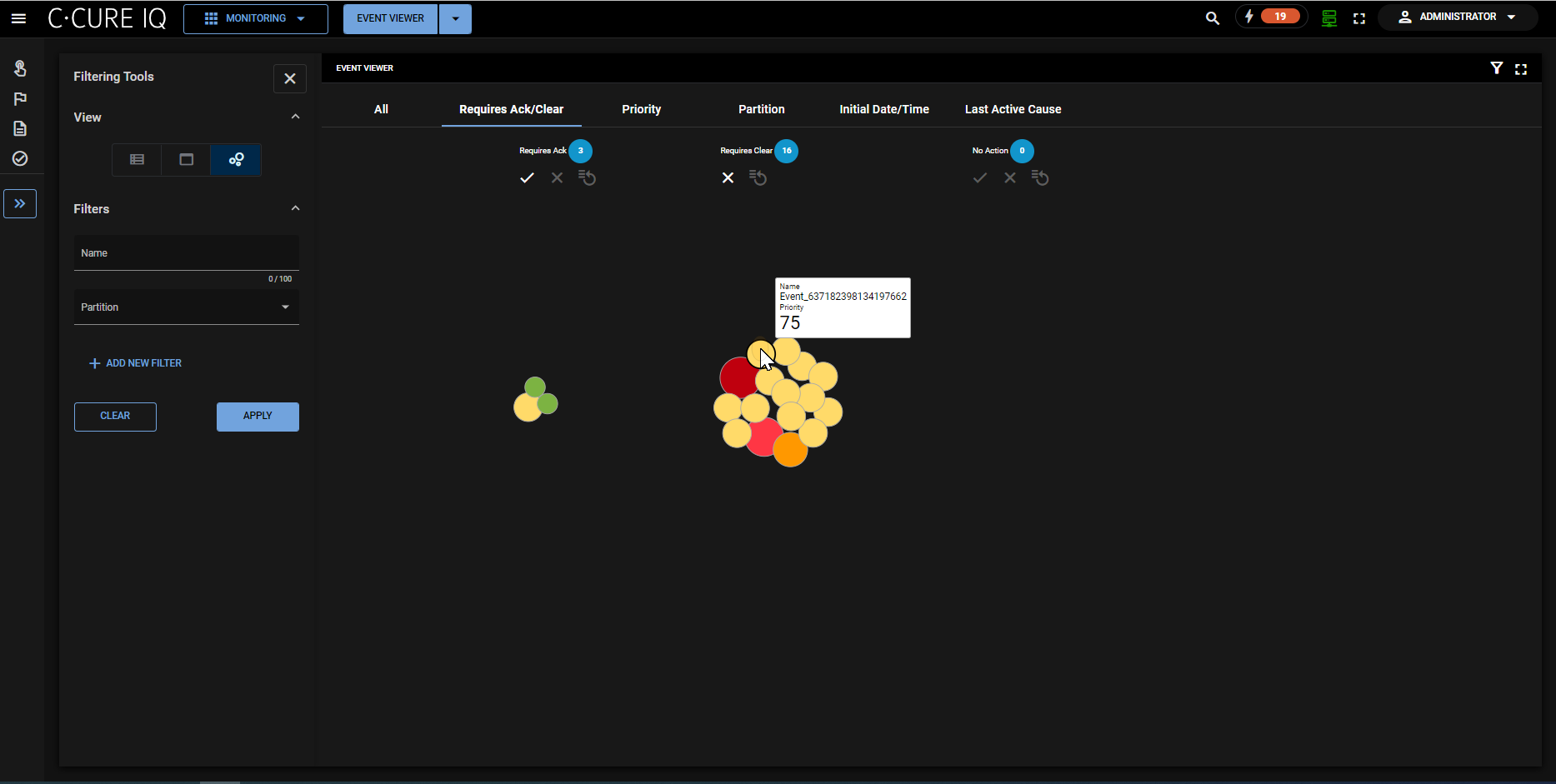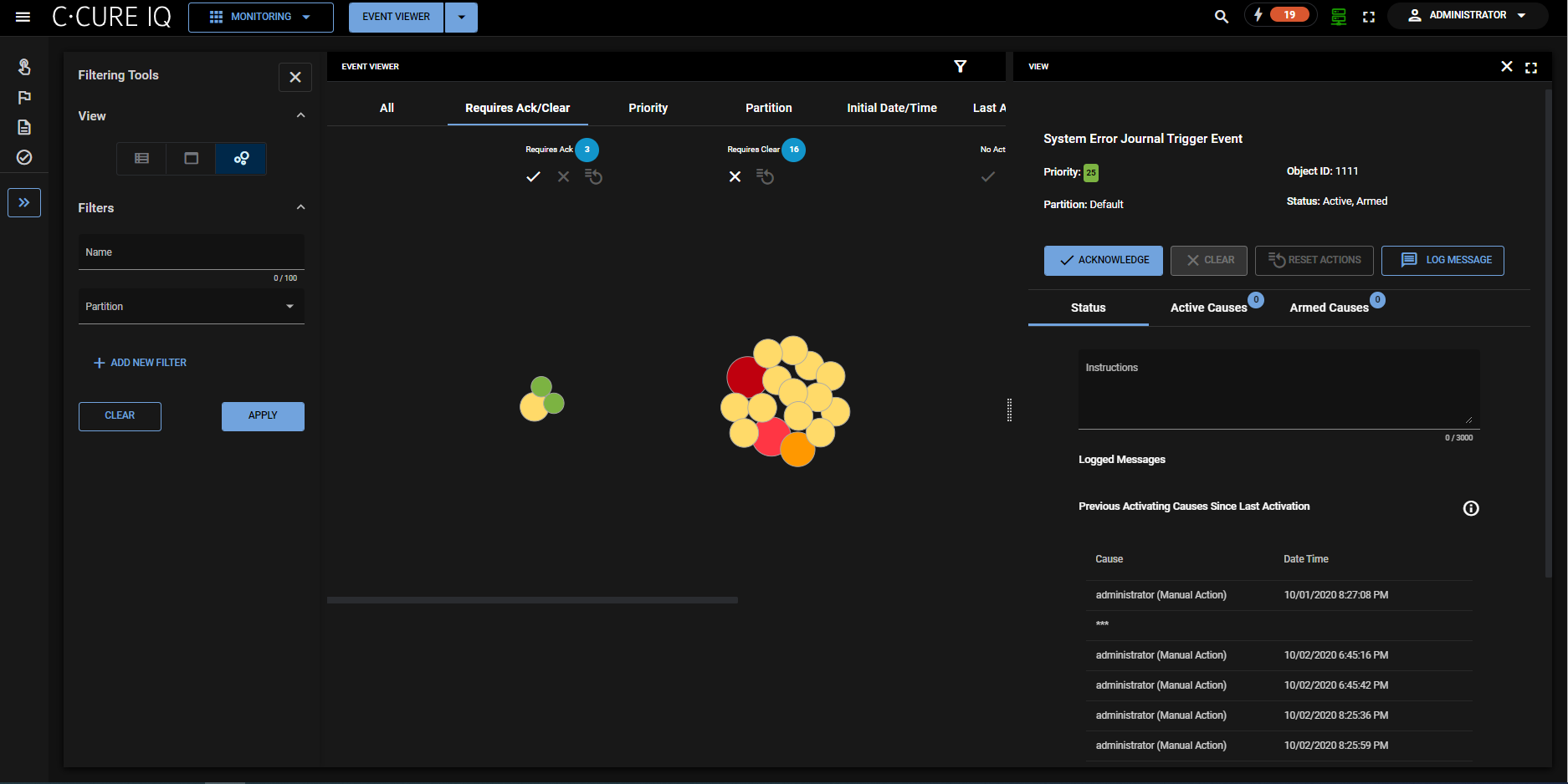 - Displays event nodes in the following groups: Requires ack, requires clear, no action.