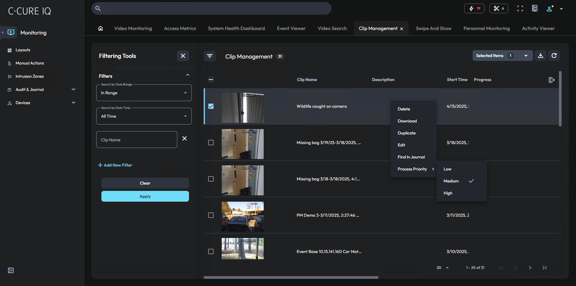 of context menu options, see Clip Management context menu . Figure 1. Clip Management page