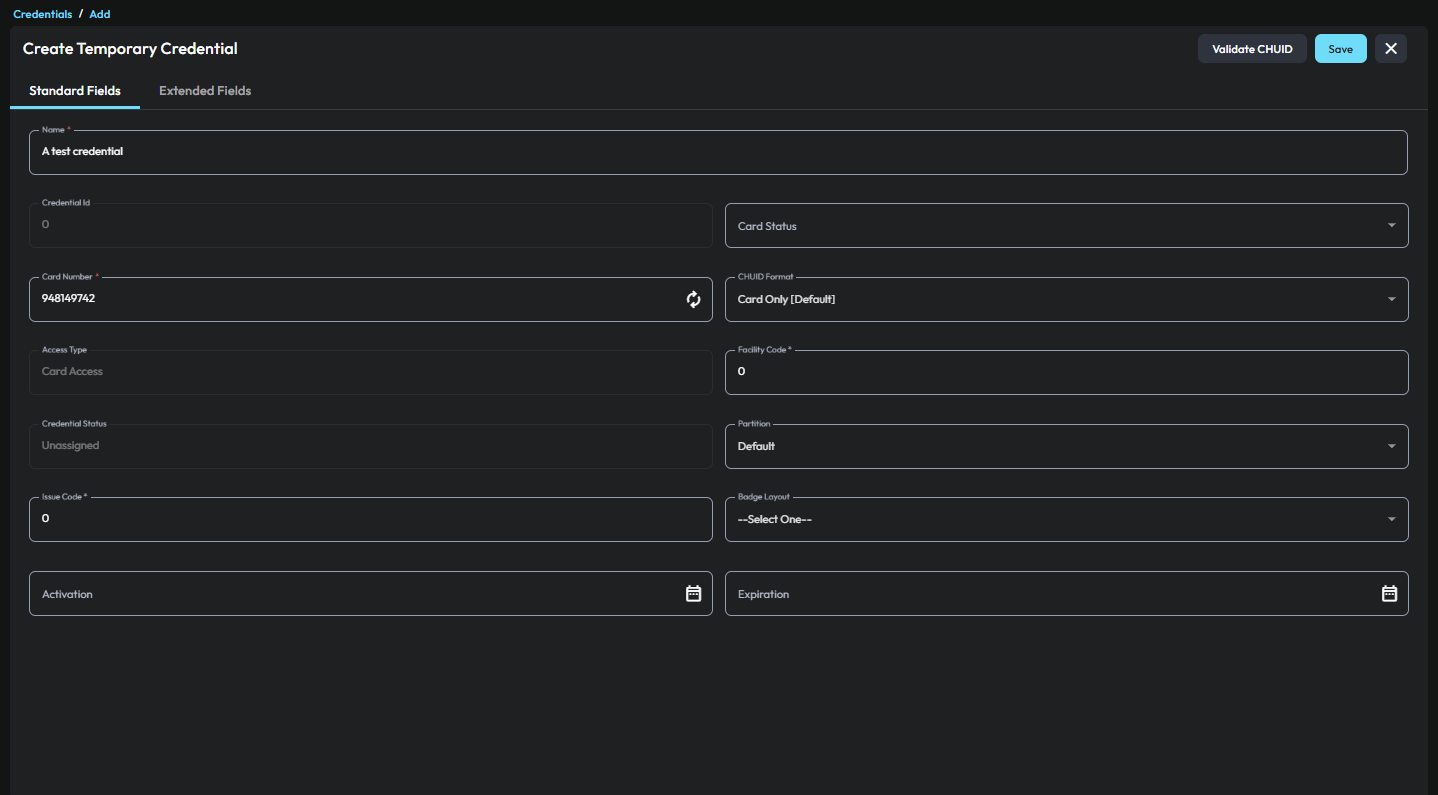 Creating credentials Use the Credentials editor to create credentials for personnel. You can access the Credentials editor from the Credentials tab, and from the Personnel editor. Figure 1. The Credentials editor Click the Credentials tab. Click Add New. Configure the credential settings. For more information, see Credentials editor fields. Click Validate CHUID. Click Save.