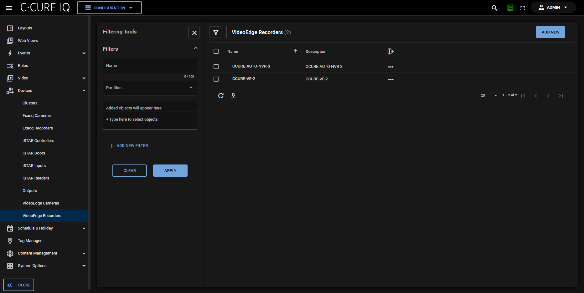 Note: Add VideoEdge NVRs and Exacq NVRs to C•CURE IQ from the Devices tab.