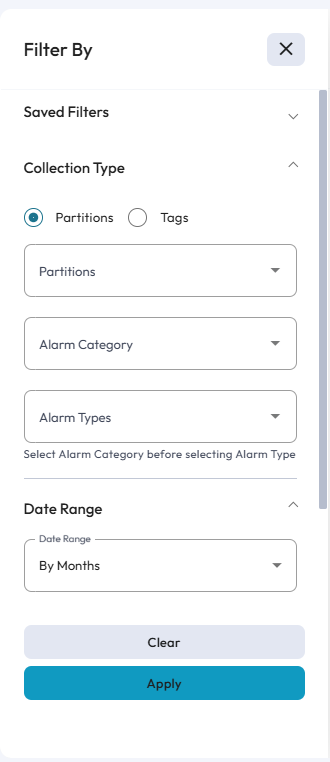 | Apply | Apply the filter based on the selected values and fetch the alarm data. |