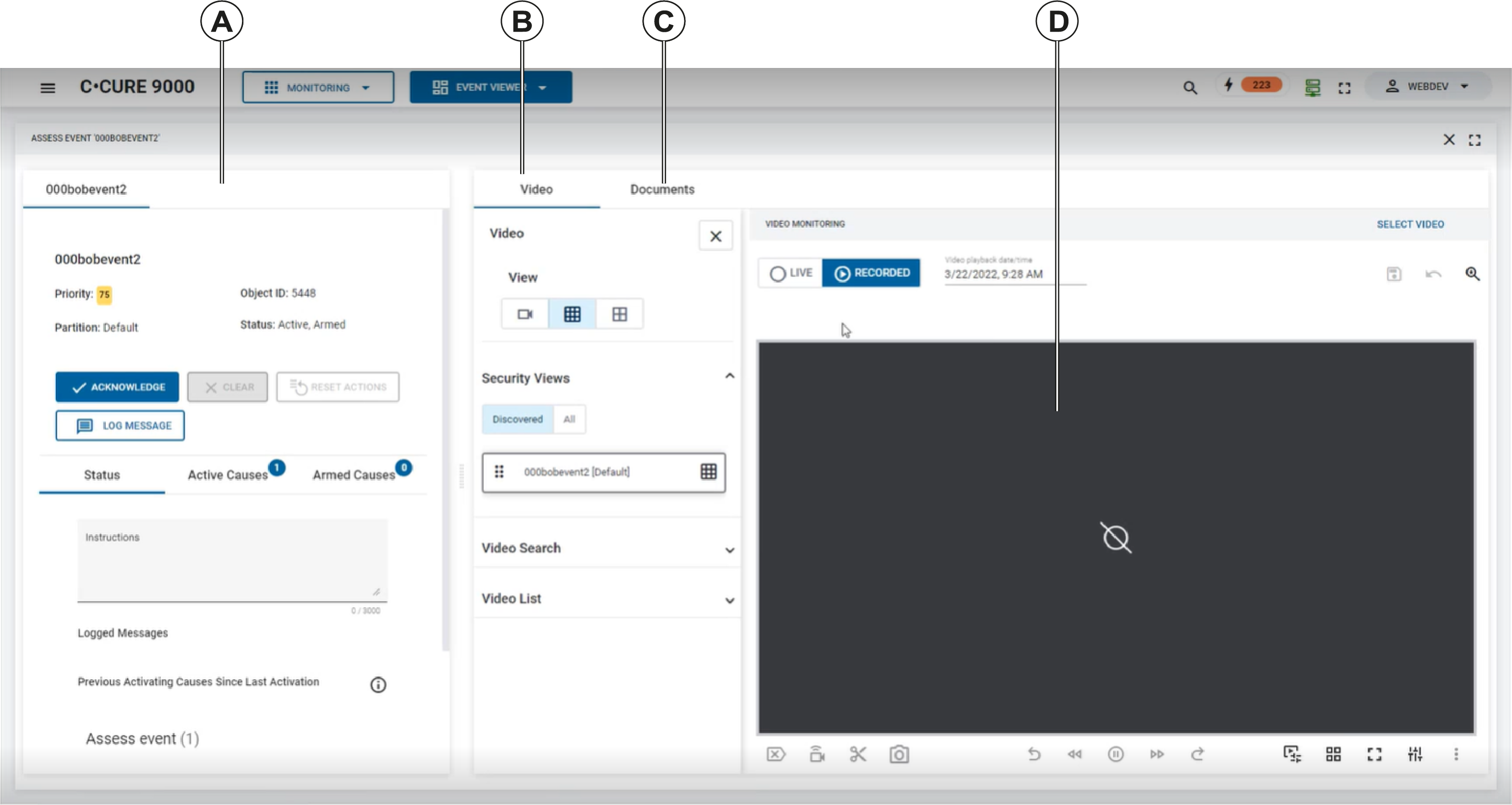 | B | From this pane, you can perform the event assessment. The Video tab is selected by default. |