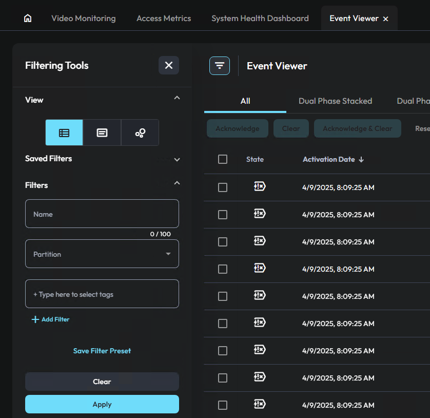 | Clear | Click to clear the Event. If the Event requires a log message for clearing, a Log Message dialog box appears so the operator can type in a log message. |
