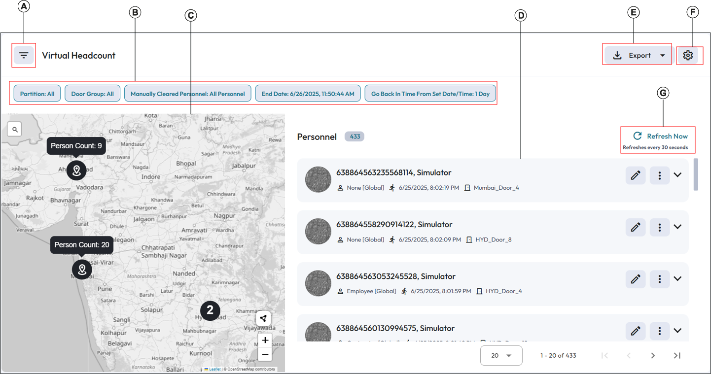 Virtual headcount works in tandem with Last known location data. You can use it to quickly determine what group of people is at a particular location, such as Door Group, General Tags, Location Tags, and Partition.