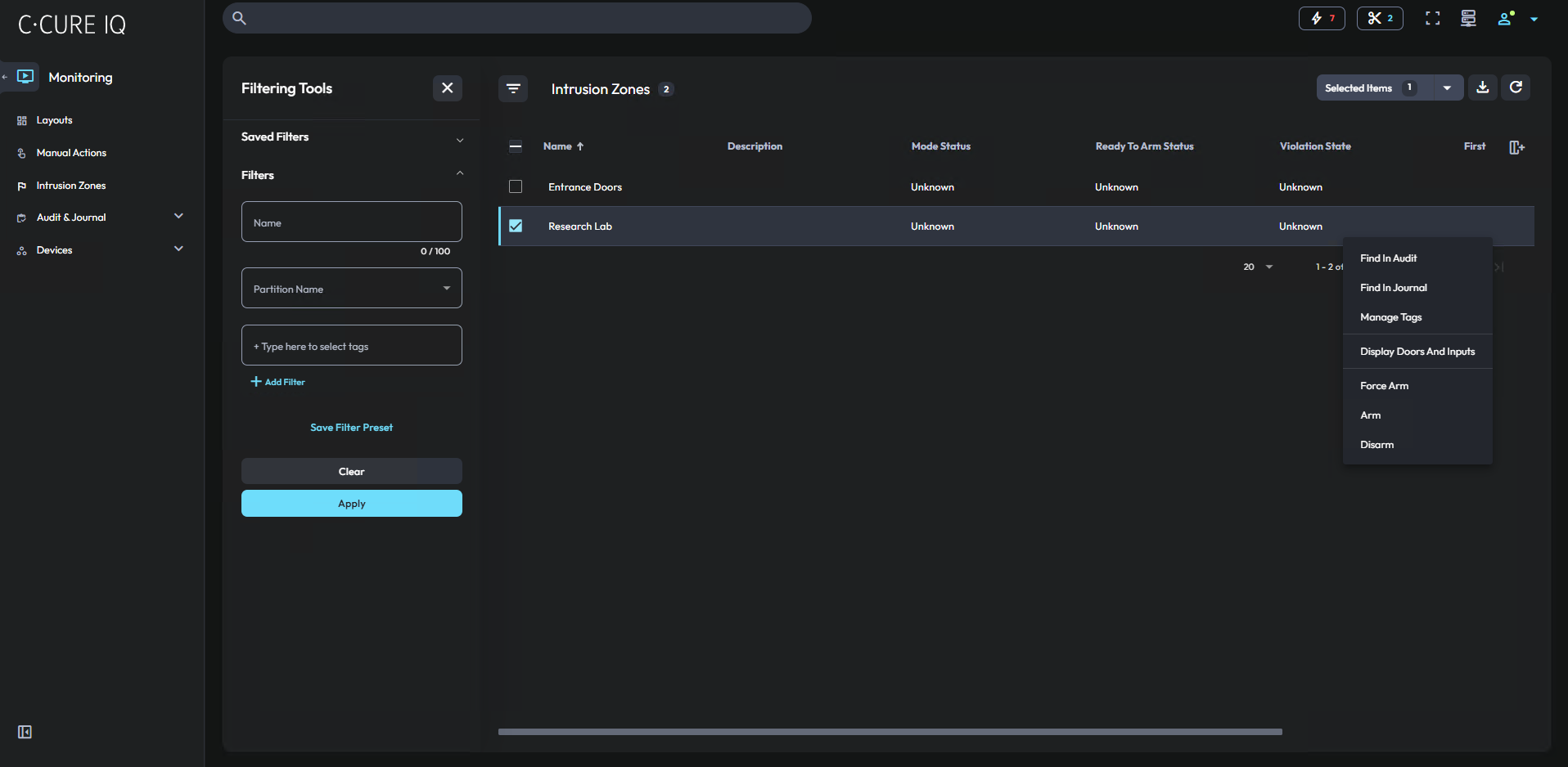 From the Intrusion Zones tab, you can view a list of intrusion zones that are configured in your C•CURE IQ system. You can monitor the status of the intrusion zones, and you can interact with intrusion zones through the context menu.