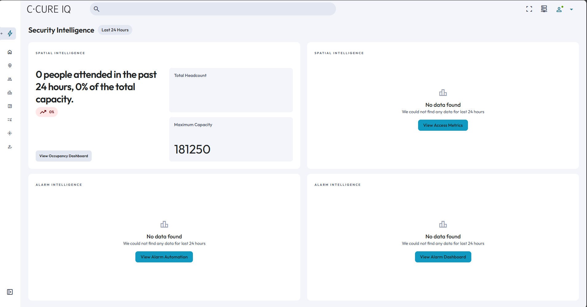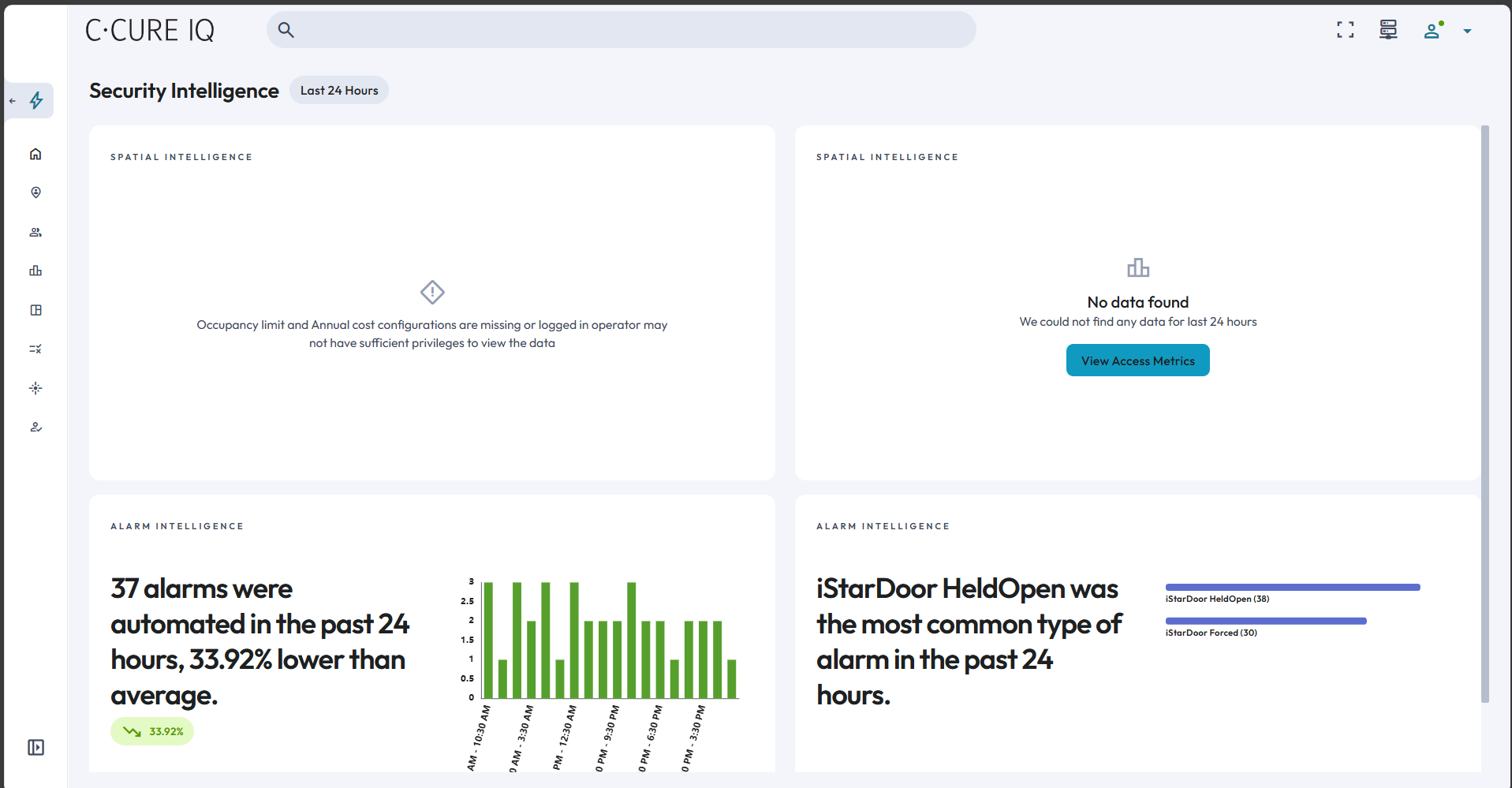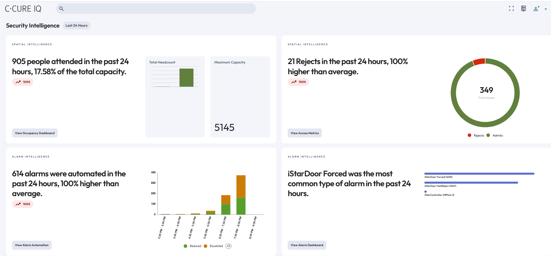 Hover over the charts to view the numeric value of the data. You can also access occupancy dashboard, access metrics, alarm dashboard, and alarm automation dashboard from Security Intelligence landing page.