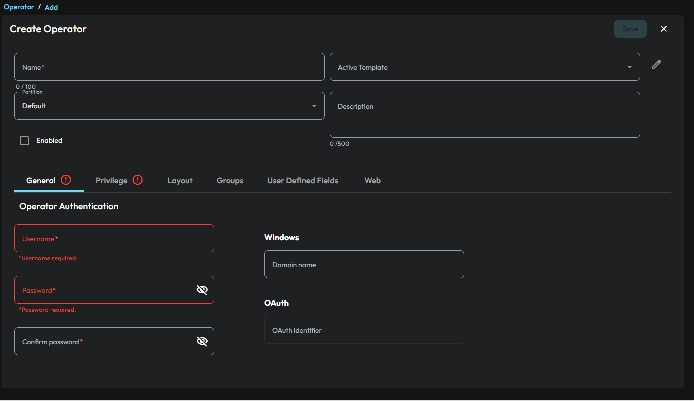 You use the Operator editor to assign privileges to an operator. A privilege is a collection of rights to use access control objects. For example, readers, doors, inputs, outputs, and schedules. In C•CURE 9000 you use the Privilege editor to create privileges. For more information about privileges, refer to the C•CURE 9000 Software Configuration Guide.