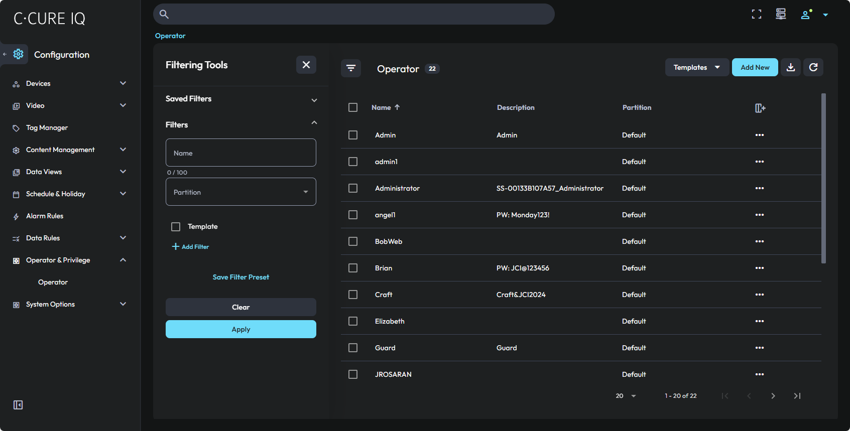 You can also configure and use partitions in your system so that different operators can access security objects from their assigned partitions. You assign privileges and schedules to operators to control their access to the objects that are associated with a particular partition.