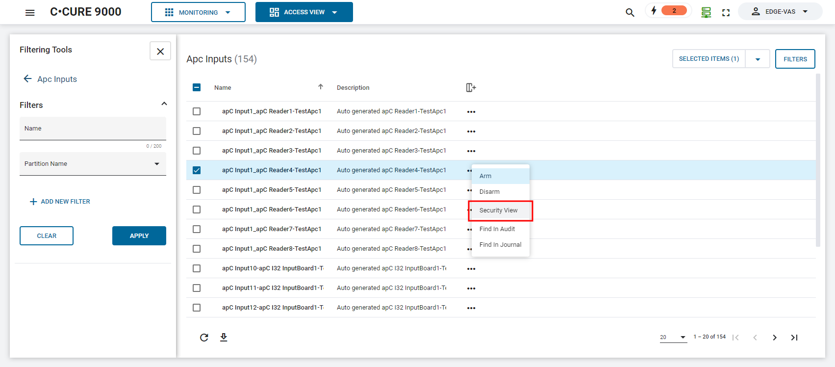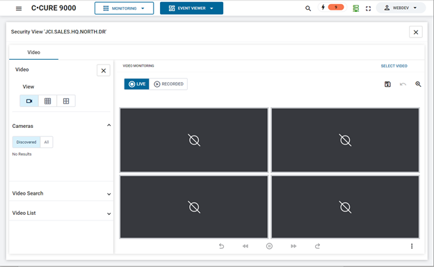 Use Security Views to view devices with their associated video and objects compiled into one screen. Find a device and quickly jump to Live and Recorded Video for the device. View the video from the cameras that are closest to the alarm source or incident. You can use this feature to evaluate an object to view the related incident, the location of the alarm source, and review the information of how to deal with the incident specific to your business requirement. Security Views are available from devices and journal messages for objects such as related cameras. You can access a security view for compatible devices from the Device Actions module.