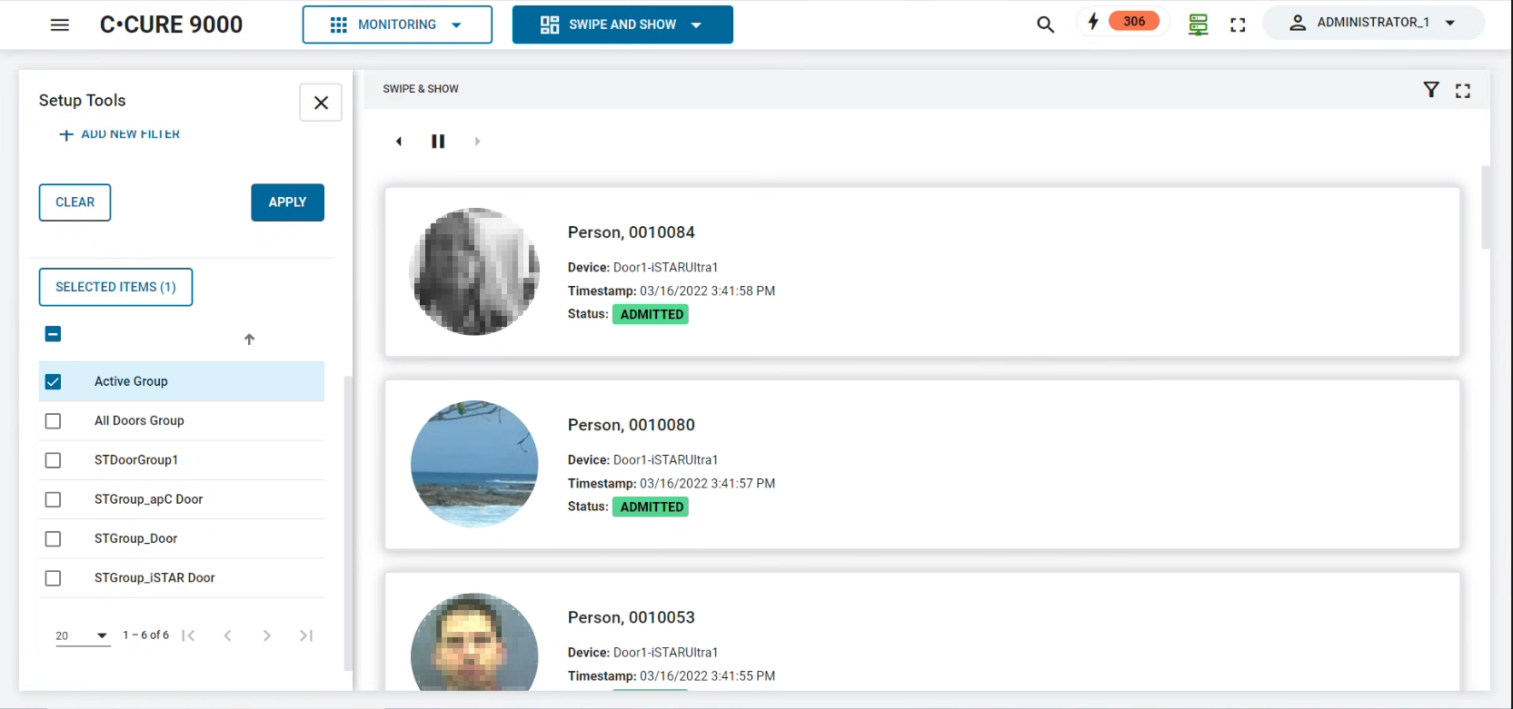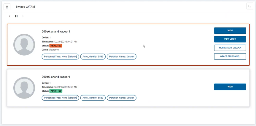 The Swipe and Show module displays a live list of personnel who swipe their card to gain access to an area. The most recent card swipes are displayed at the top of the list. Operators can view admitted or rejected card swipes, and if a card is rejected the user can perform a momentary unlock door or grace personnel to grant admittance. If a video camera is associated with a door or elevator, you can also view a video of the card swipe. See Viewing a swipe result for more information.