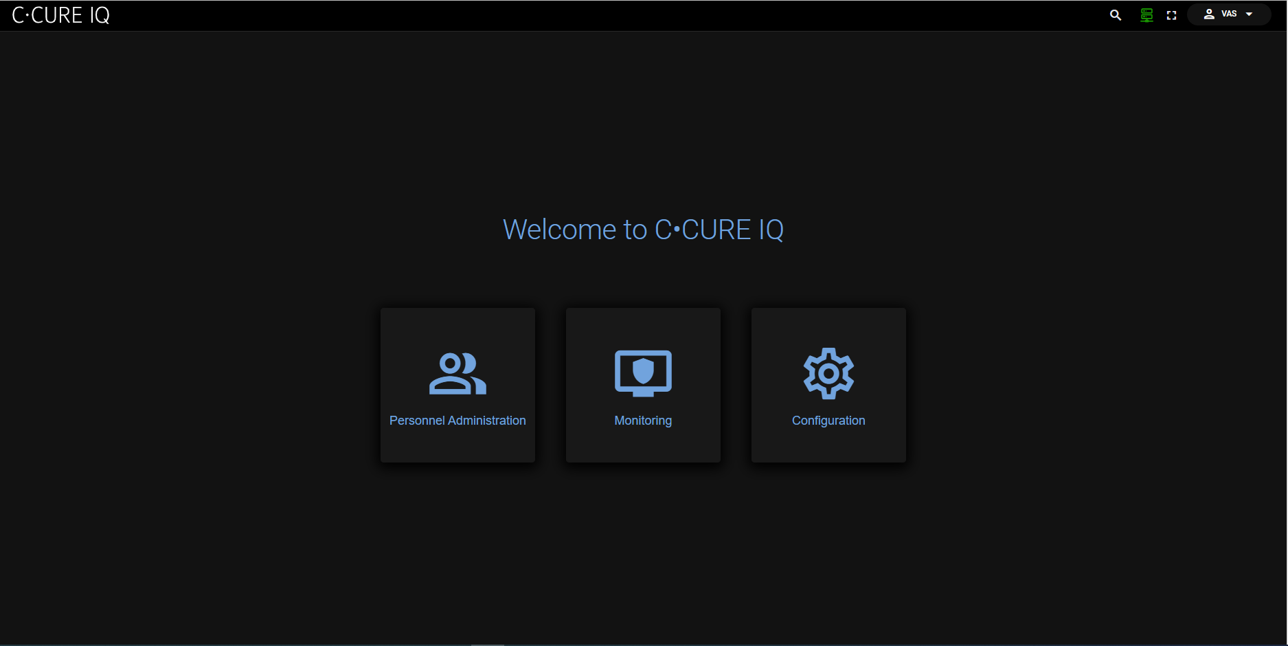 When you log on to C•CURE IQ, the opens. From this page, you can select Personnel Administration, Monitoring, or Configuration.
