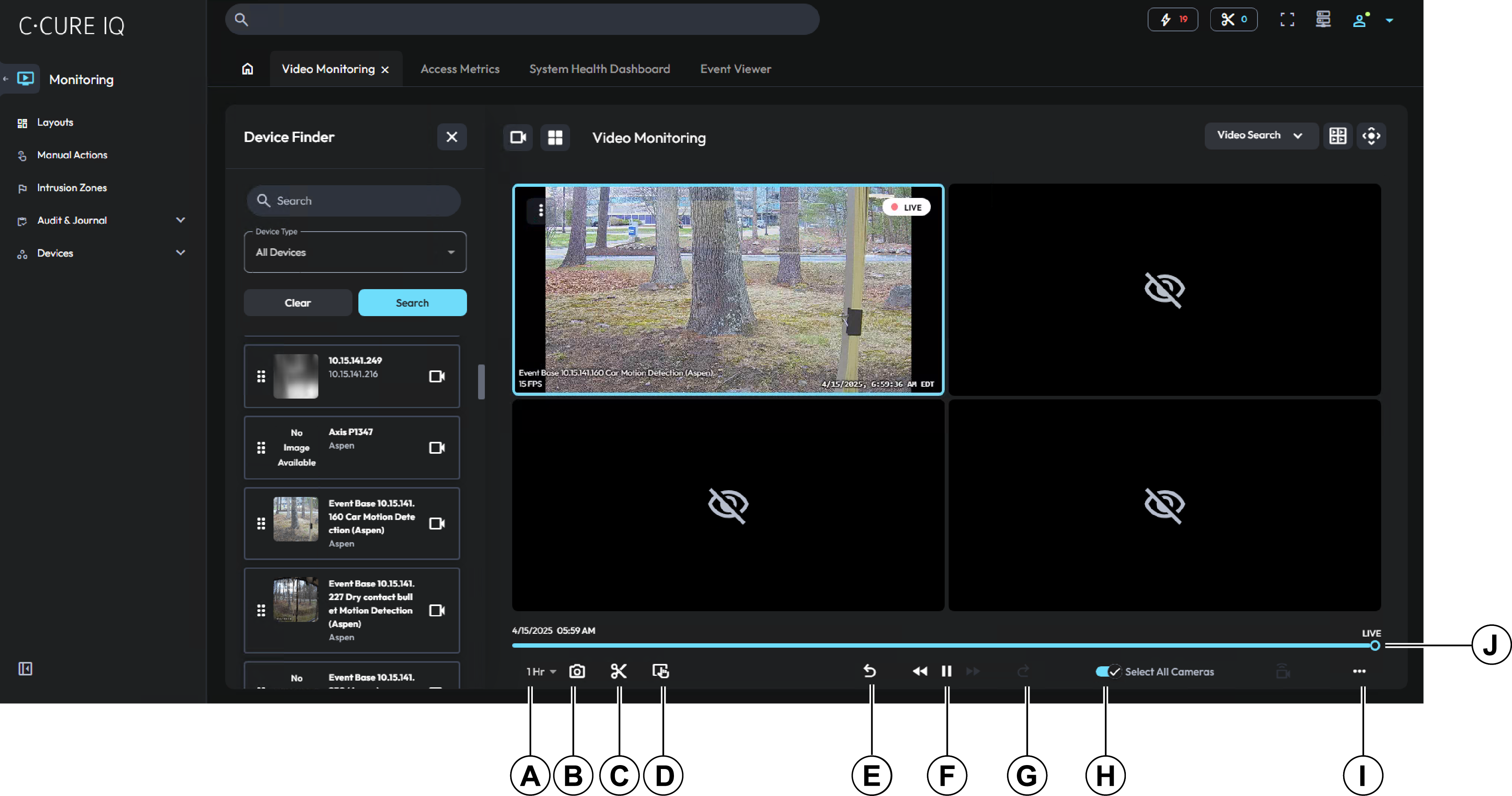 | E | Jump Back | Click the jump back icon to navigate back through the selected video feeds. Choose from 30 seconds, 1 minute, 5 minutes, 10 minutes, 30 minutes, or 60 minutes. Click Specific Date & Time to choose a date and time from a calendar selector menu. |