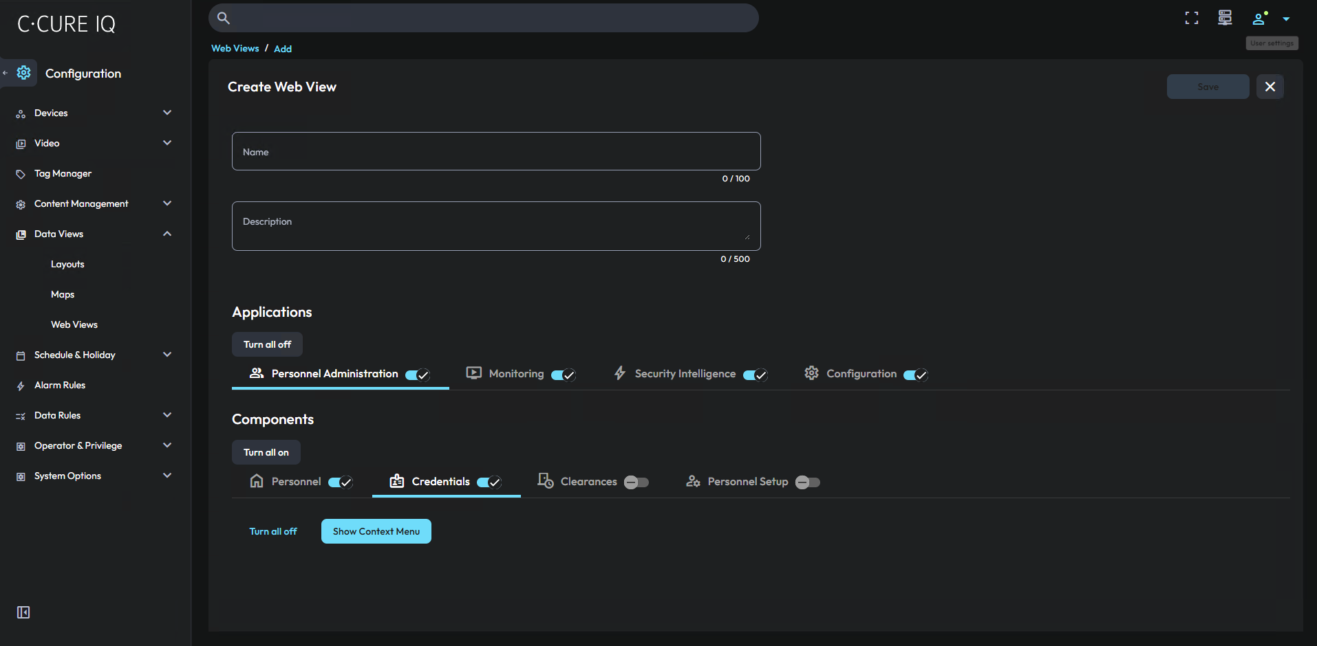 With the Web Views editor, you can change the appearance of C•CURE IQ for different operators. Customize the web view to allow operators to use different areas of C•CURE IQ.