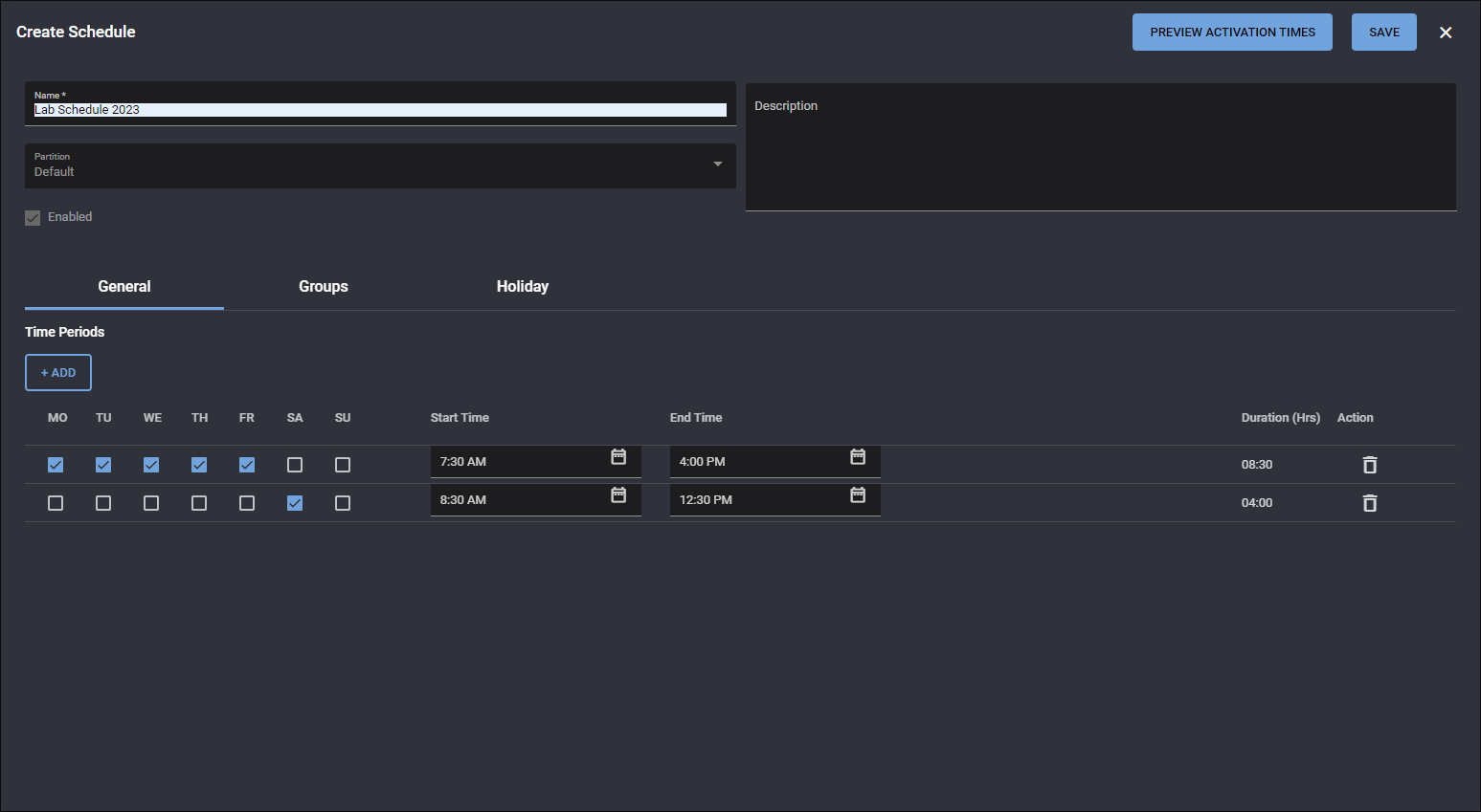 You can include one or more Holiday Groups on a schedule. Holiday Groups specify the Holidays that apply to the Schedule, on which days normal activation of the Schedule does not occur.